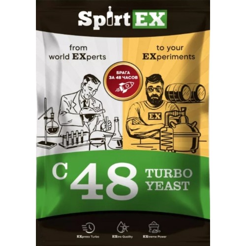 Спиртовые дрожжи SpirtEX С48 созданы из особенных штаммов дрожжей, которые характеризуются своей устойчивостью к высоким температурам и отличными способностями к брожению. Кроме дрожжей, в состав входят питательные компоненты, витамины и микроэлементы. Спиртовые дрожжи SpirtEX С48 имеют двойное применение: вы можете получить до 20% алкоголя (в некоторых случаях до 21%) за 7-10 дней или 14% за 48 часов. Выбор уровня алкоголя напрямую зависит от количества добавленного сахара в начале процесса брожения.
